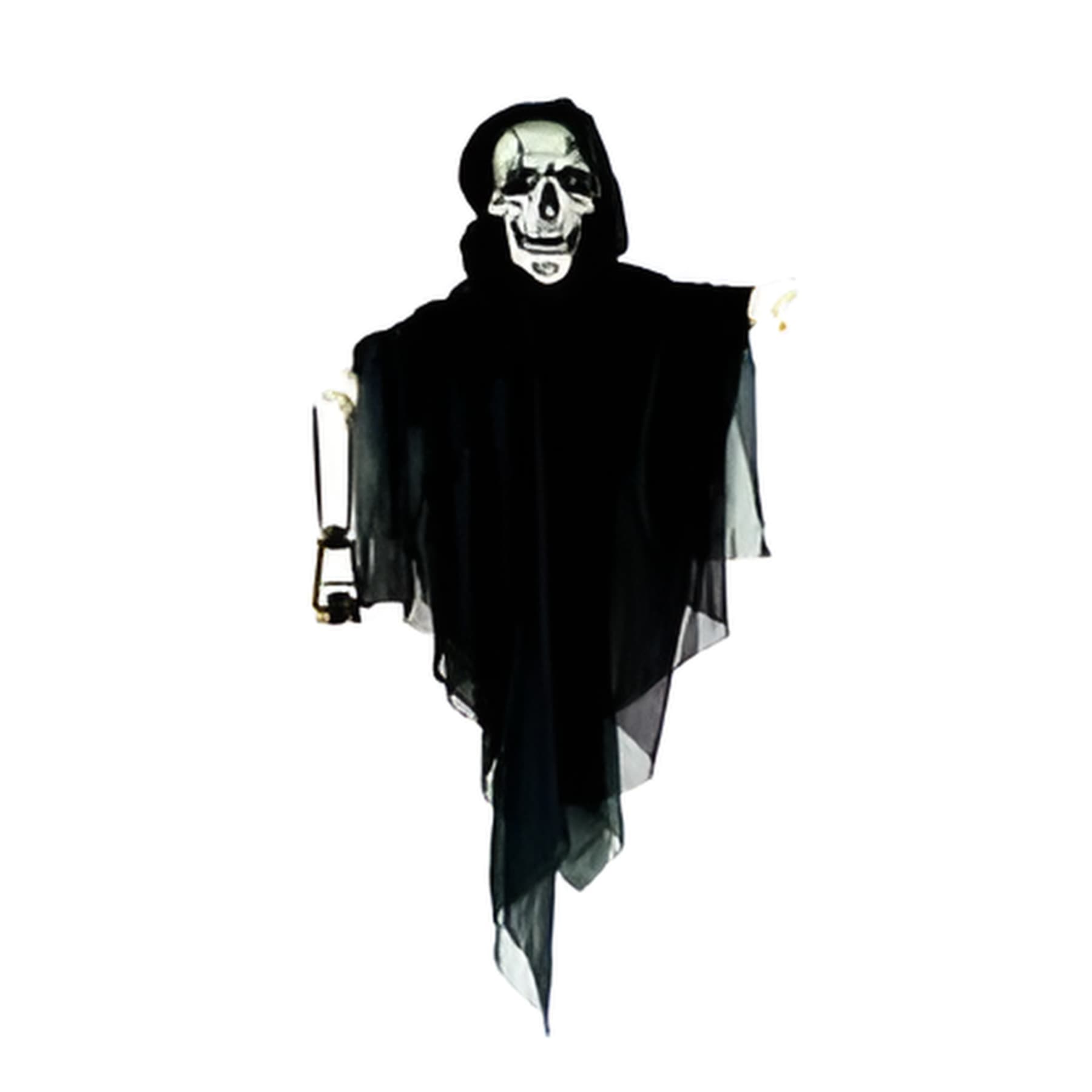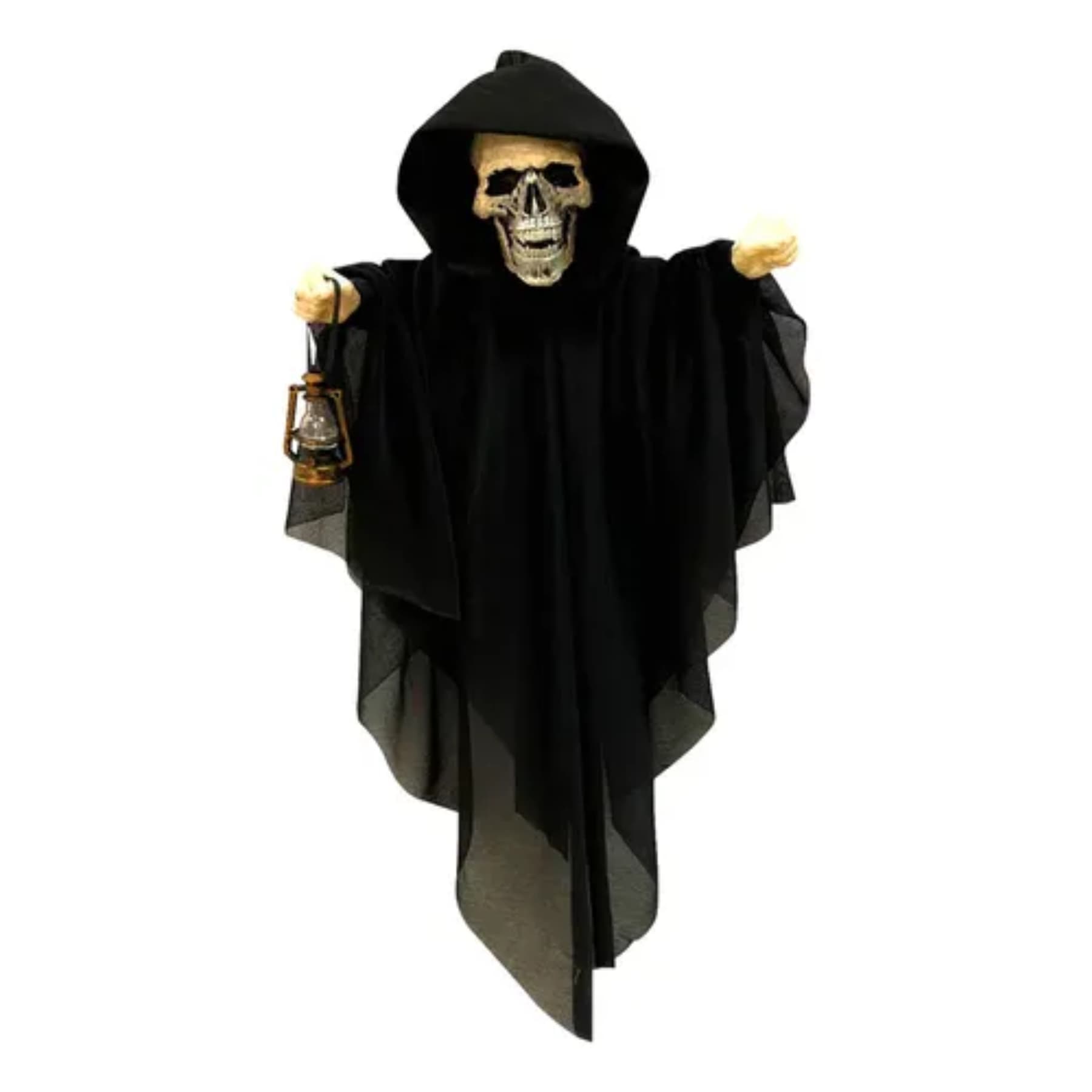 El Muñeco Muerte Colgante es una decoración clásica de Halloween que representa a la Parca o la Muerte. Generalmente está elaborado en materiales ligeros como tela, plástico o espuma, con túnica negra rasgada, calavera y brazos móviles o colgantes. Se puede colocar suspendidos en puertas, techos, árboles o ventanas, generando un ambiente terrorífico y llamativo para fiestas y decoraciones temáticas.