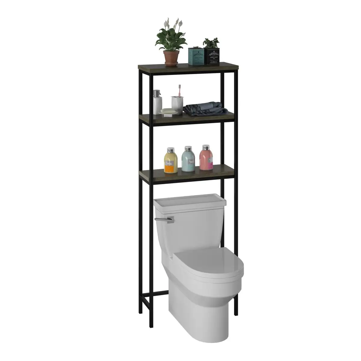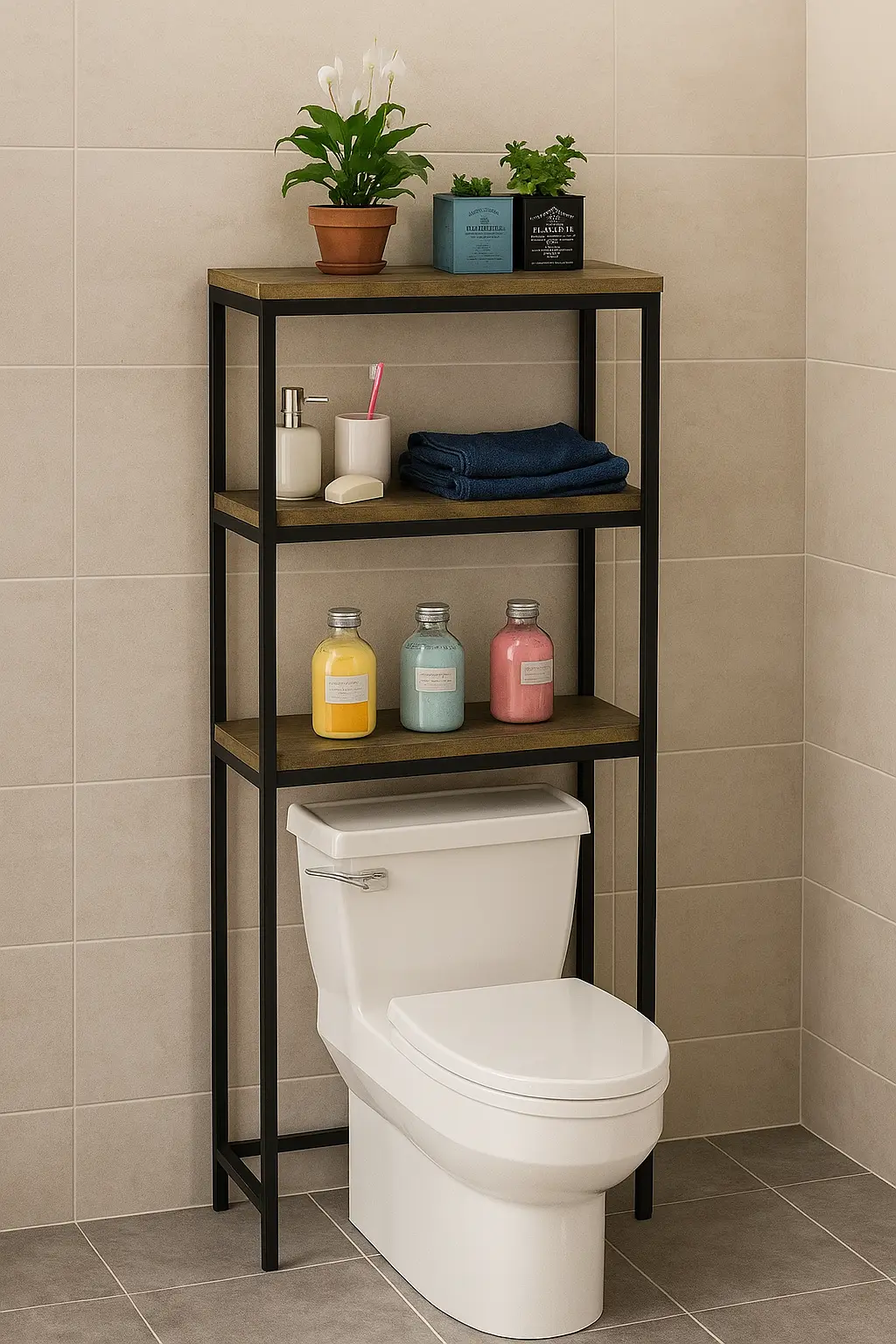 Su estructura metálica firme y estilizada ofrece soporte estable para artículos de aseo, toallas y decoración, manteniendo el baño siempre ordenado y con un toque moderno.